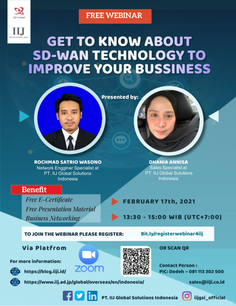 Untuk lebih lengkap nya, Ayo Bergabung dalam webinar chapter 4 kami untuk lebih mengenal lebih baik tentang teknologi SD-WAN by velocloud dengan tema, “Get to Know about SD-WAN technology to Improve Your Business”. Persembahan dari PT. IIJ Global Solutions Indonesia.