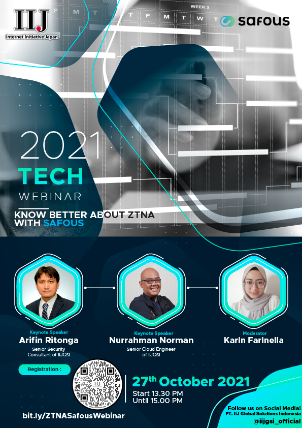 IIJ dan Safous Mempersembahkan Webinar “Know Better about ZTNA with Safous” yang akan diselenggarakan pada 27 Oktober 2021 dengan Pembicara Arifin Ritonga selaku Senior Security Consultant dan Nurrahman Norman selaku Senior Cloud Engineer yang akan menjelaskan mengenai apa itu ZTNA dan Bagaimana ZTNA akan menjadi Solusi Terbaik bagi Remote Work Environment. Selain itu Safous sebagai salah satu pecetus ZTNA kan memberikan PoC Gratis bagi perusahaan yang ingin bergabung dan mencoba Zero Trust Network Access sebagai Next Level IT Security!